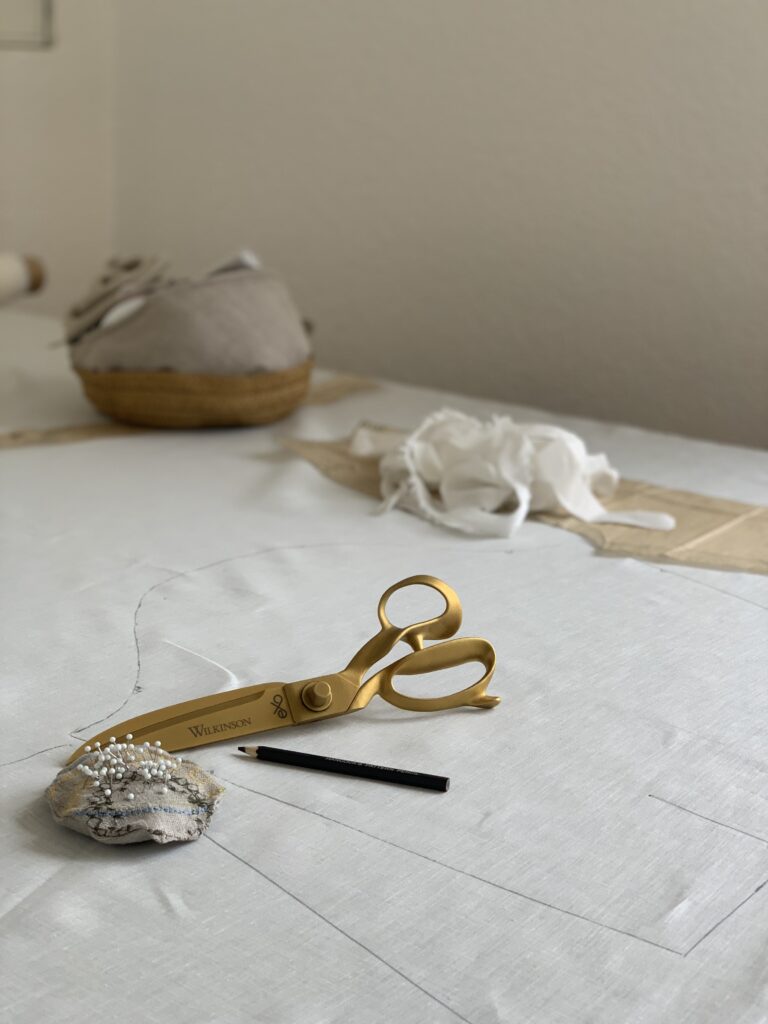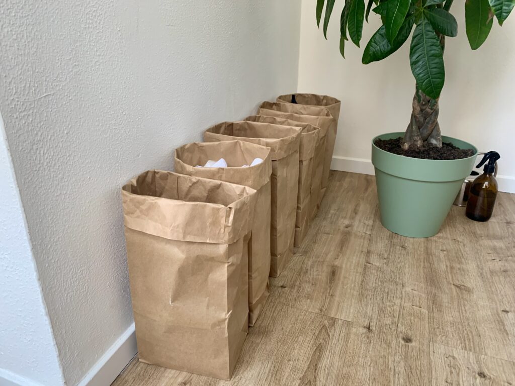 Beim Zuschnitt anfallende Stoffreste werden zunächst – während des jeweiligen Nähprojektes – nach ihrer jeweiligen Größe in einer Papiertüte gesammelt. Die Grundsortierung der Leinenstoffreste erfolgt dabei nach fünf Kriterien: