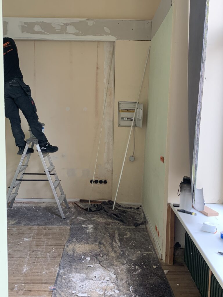 Auch zahlreiche Kabelstränge verliefen an den Wänden, die nur mit Hilfe von Trockenbauarbeiten sauber verborgen werden konnten. Allerdings einen Trockenbauer zu finden, der sich auf Nachhaltigkeit spezialisiert hat, ist mir nicht gelungen. Also beauftragte ich vorab wenigstens einen ortsansässigen Schreiner damit.