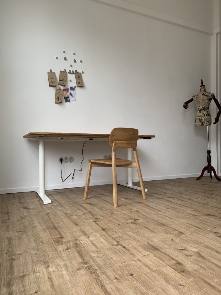 Dadurch, dass der Tisch in seiner Höhe verstellbar ist, konnte ich mir die Ausschau nach einem adäquat beweglichen, ökologisch hergestellten Sitzmöbel ersparen und wählte (ebenfalls bei ekomia) einfach einen schlichten, fest stehenden und formschönen Stuhl mit Lehne aus massivem Holz (Eiche aus polnischem Waldbestand, ebenfalls FSC®-zertifiziert). Tisch und Stuhl habe ich mir vorab im Showroom in Berlin ebenfalls angeschaut, denn einen guten, zu einem passenden Stuhl kann man nicht online ausprobieren. Die Langlebigkeit dieser beiden hübschen Gesellen, die damit ins kleine Pony-Atelier eingezogen sind, dürfte absolut gegeben sein. Mit einem veganen Möbelöl werden sie sporadisch gepflegt.