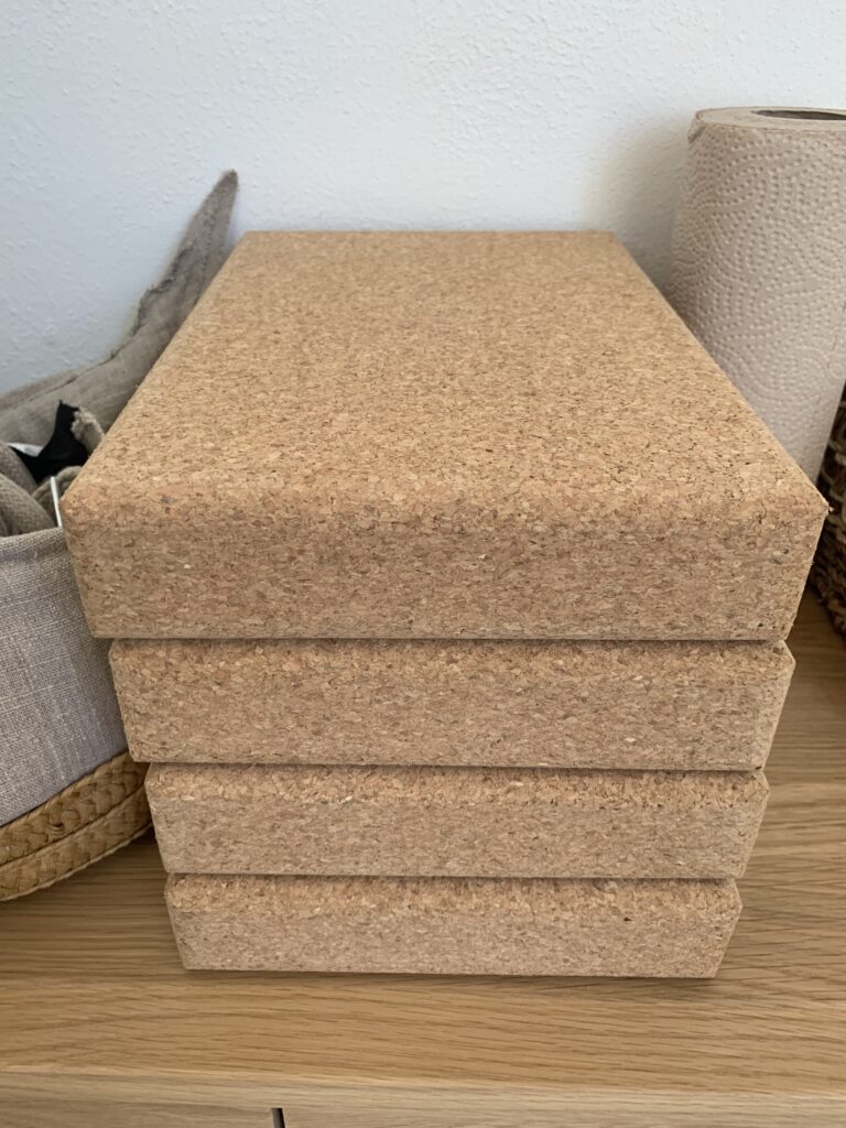 Die im nachfolgenden Foto abgebildeten Blöcke aus Kork werden eigentlich im Yoga eingesetzt – im Pony-Atelier werden sie als Sideboard-schützender Puffer unterhalb der zwei Tischplatten genutzt, womit parallel die Höhe des Zuschneidetisches von 78 cm auf insgesamt 86,5 cm steigt.