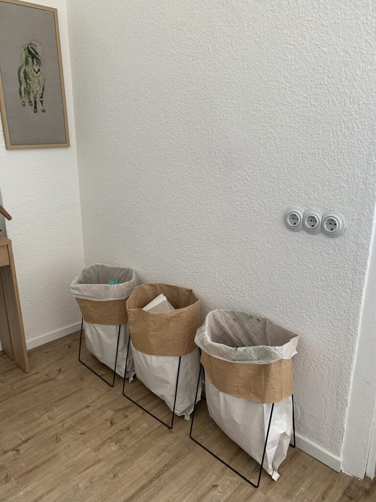 Korrekte Mülltrennung ist stets ein wichtiges Thema und natürlich ist es das auch im Pony-Nähatelier. Das sind die Ressourcen von morgen und denen sollten wir alle – neben einem verantwortungsbewußten Kauf von Dingen – noch weitaus mehr Bedeutung zumessen. Diese schlichten, dennoch formschön und zugleich praktisch designten Papiertaschen-Abfallbehälter (www.kolor.de) werden übrigens in Deutschland gefertigt. Und das grüne Pony passt dolle auf, dass da auch nichts in eine falsche Tüte kommt.