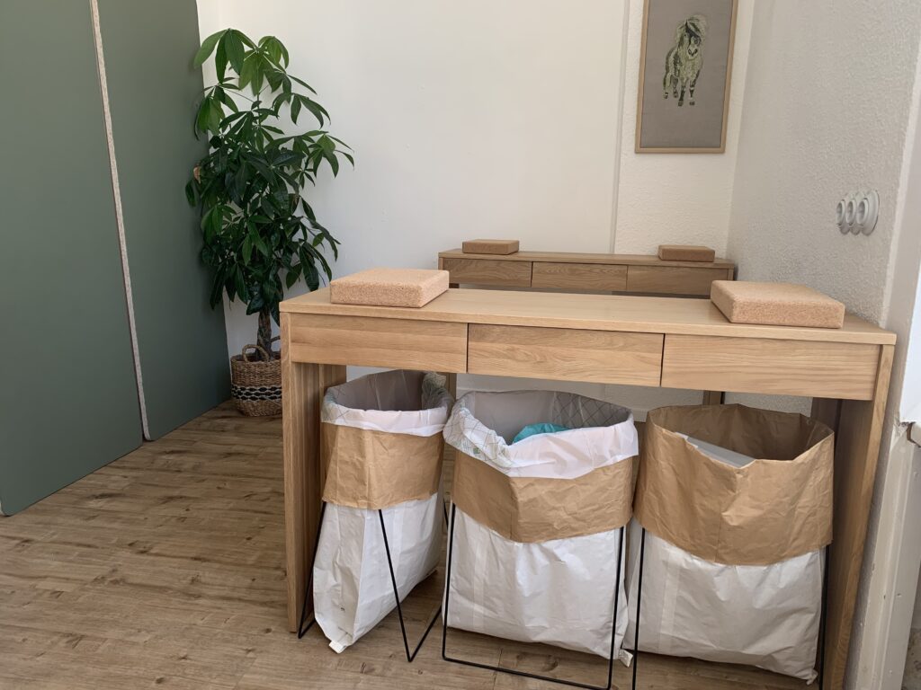 Sehen Sie das Sideboard aus massiver Eiche auf dem oben abgebildeten Foto im künftigen Zuschneideraum? Davon hatte ich im Vorfeld bereits zwei bei einem Online-Möbelhändler (www.tikamoon.de) mit Sitz in Frankreich bestellt. Dieser hat sich laut eigenen Aussagen seit 2008 auf die nachhaltige Herstellung von Massivholzmöbel (80% sind aus massivem Holz) spezialisiert, kann seit 2018 eine FSC®- Produktkettenzertifizierung für einen Großteil seiner Möbelstücke vorweisen und bietet anhand von vor-definierten Öko-Kriterien eine gut verständliche und relativ transparente Auswahlmöglichkeit aus seinem Gesamtspektrum.