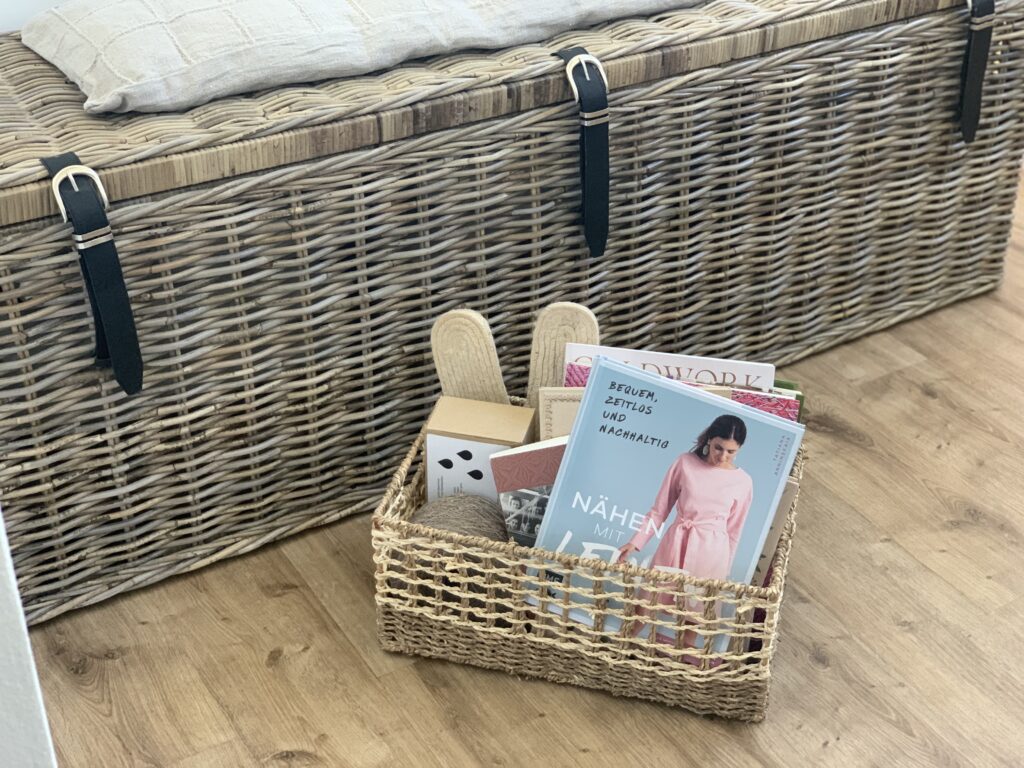 Für die echten und eigentlichen Schätze, die Leinenstoffe, hatte ich mir eine aus Rattan geflochtene Truhe mit veganen Riemen angeschafft, welche sich darüber hinaus – bei Bedarf – auch als Sitzbank würde nutzen lassen. Die anderen Dinge wollte ich ständig sehen und so auf ein generell notwendiges Minimum beschränken.